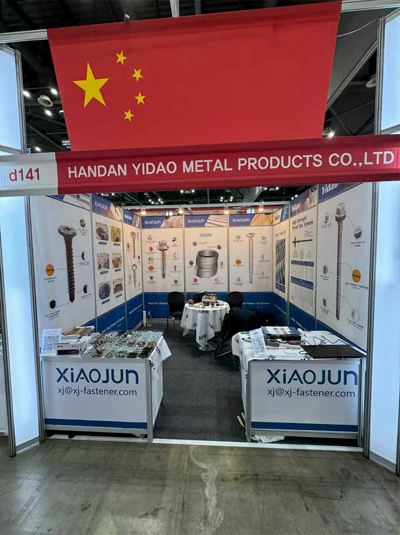 At the exhibition site,Handan Yidao's booth attracted the attention of many visitors with its distinctive brand logo and rich product displays. The Chinese national flag hanging above the booth highlighted the company's Chinese identity, while the red banner of "HANDAN YIDAO METAL PRODUCTS CO.,LTD" was clearly visible. On the exhibition stand, the company systematically showcased various metal fasteners and anchor rods under the "XiaoJun," brand,presenting them comprehensively through pictorial panels and physical displays, covering product structure, performance features, and application scenarios.